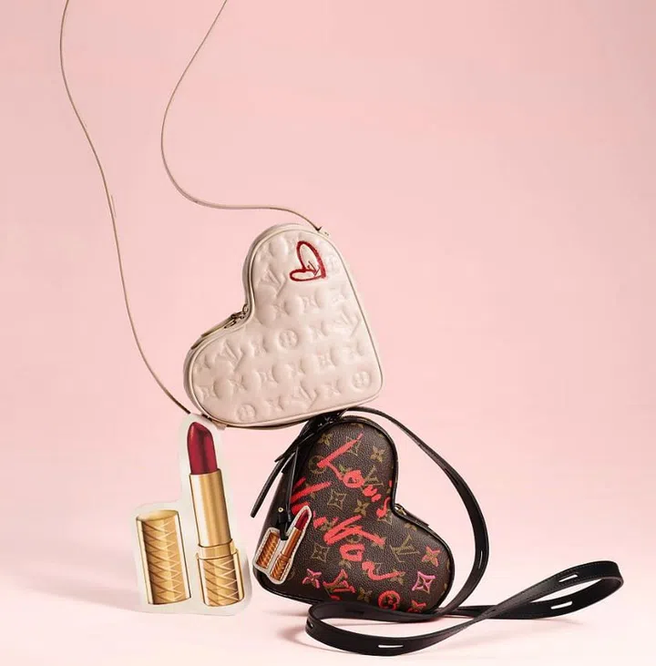 Louis Vuitton 2021七夕胶囊系列以“Fall in Love”为主题,包包以老花帆布和珍珠粉色绵羊皮为背景,用大红色的“口红”彩绘出品牌徽标和爱心图案,其中这一款Sac Cœur 心形包包,像一只玲珑精致的心形礼盒,俏皮又浪漫。