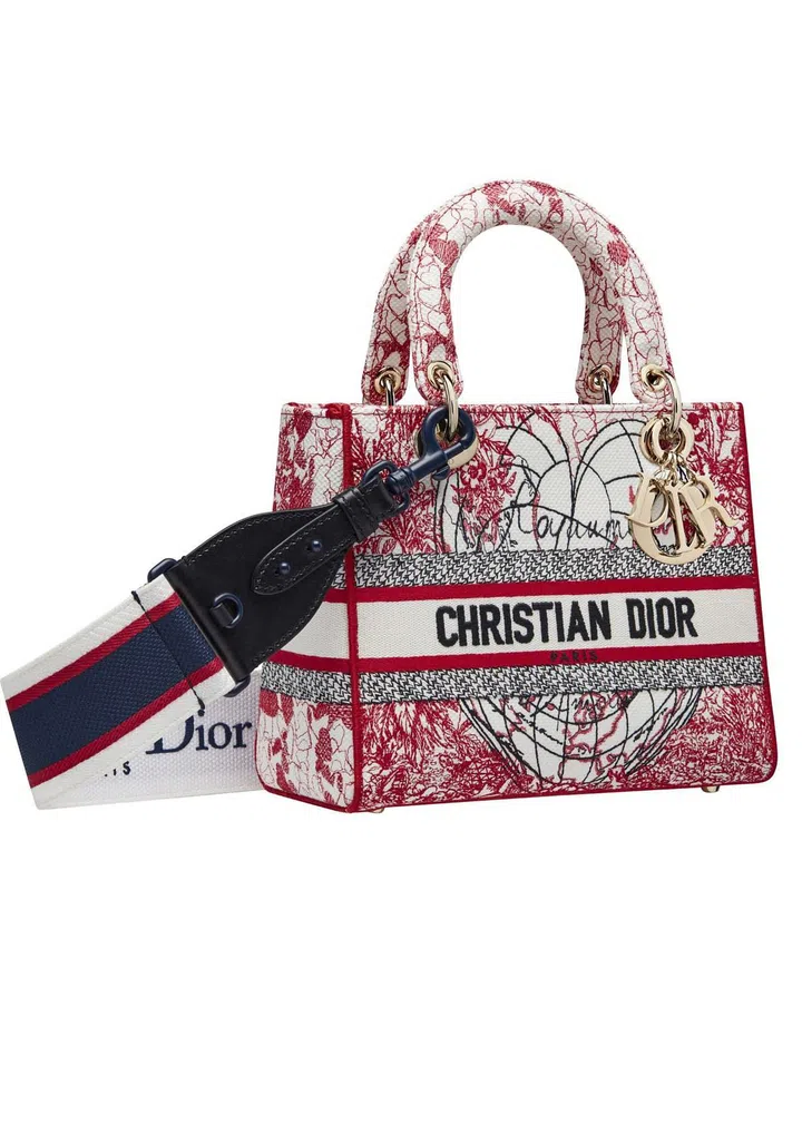 Dior的七夕Dioramour限定系列巧妙融入梦幻童话元素,这款Lady D-Lite手袋饰以红色和白色的D-Royaume d'Amour图案刺绣,灵感源自艺术家 Pietro Ruffo。手袋也可搭配可拆卸的双面刺绣宽肩带,方便手提、肩背或斜挎,演绎不同造型。