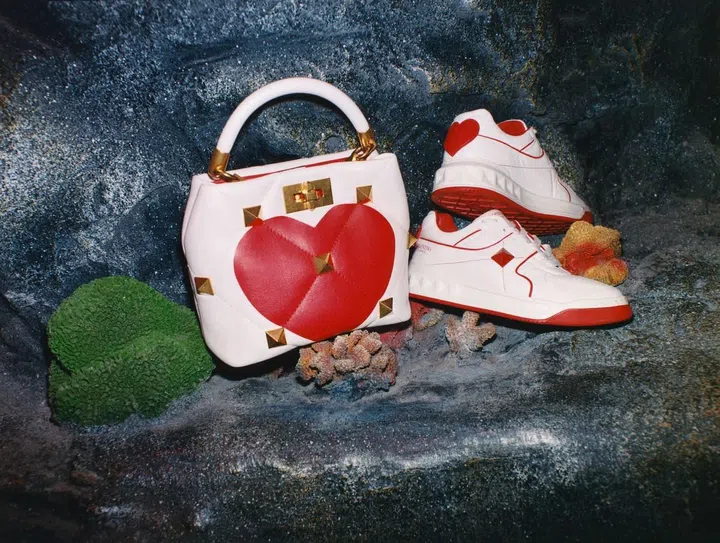 Valentino 的七夕限定系列以“爱即快乐”为主题,在经典的Roman Stud 大钉手袋系列上注入一颗红色大爱心,让图案成为包包上的主视觉元素,鲜明而热烈。