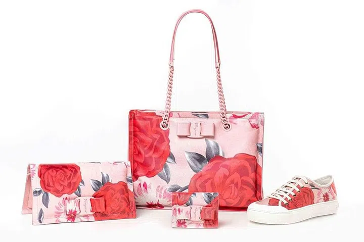 Salvatore Ferragamo以象征爱意的红色玫瑰与粉色重新诠释经典VIVA系列,从迷你肩背包、小牛皮托特包、小卡夹到休闲鞋,皆换上新装,散发古典风情的少女心。