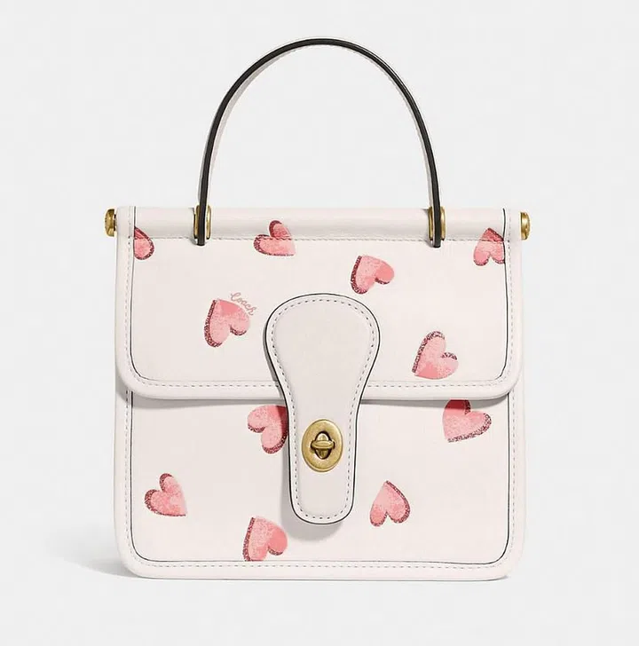 Coach 2021七夕限定系列包包将甜蜜的粉色爱心印花作为主角,点缀 blingbling 的闪粉细节,这款Willis 18 手提包采用白色小羊皮制成包身,正面点缀11颗粉色爱心印花,寓意“一生一世”。