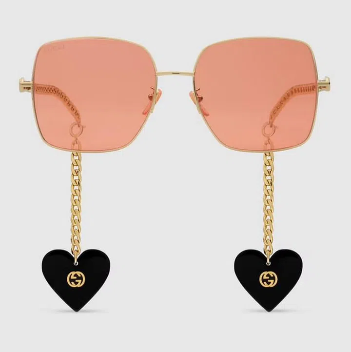 Gucci的方形镜框太阳眼镜采用金色金属材质搭配橘色镜片,饰有俏皮可爱的心形吊坠,呈现独具一格的时尚风格,洋溢着梦幻般的甜蜜氛围。