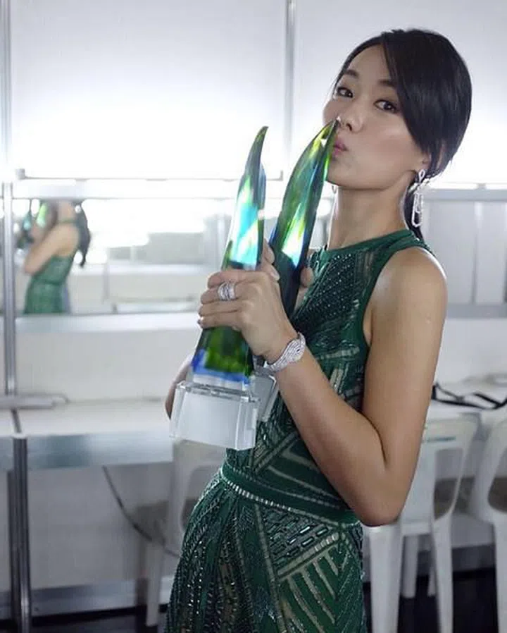 2018年视后林慧玲身着Elie Saab透视礼服,佩戴Goldheart珠宝,绿色让Rebecca 的皮肤更显白皙,性感剪裁又带有几分高雅气质。