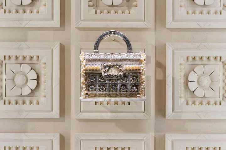 Zardozi金线刺绣和3D立体串珠等精妙刺绣工艺,赋予作品丰富的纹理变化;精致叠加的珍珠、璀璨夺目的水晶与极具雕塑感的装饰元素,令手袋散发灵动光彩。手袋选用多种色调的缎面材质,细腻呈现考究细节、无论是大理石的精美纹理、金属的铜锈效果,还是精巧的铁艺装饰,每一处皆精雕细琢。每款手袋均搭配珠宝提手与 Efflorescence 花卉饰扣,将天然宝石、牛角镶嵌及密镶水晶等珍贵元素融为一体,彰显至臻工艺。