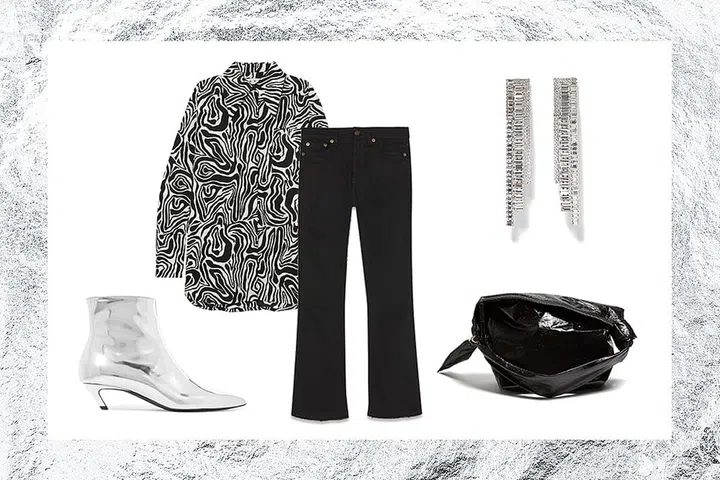 想要顺应银色潮流又不想太抢眼,穿上银色鞋子是一个好办法。搭配黑色牛仔裤或印花上衣,再加一对水晶耳饰,增添华丽感。