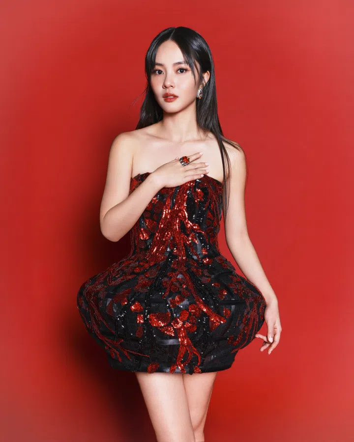 黄暄婷(Chantalle Ng)在《红星大奖2025》首次担任主持人,表现可圈可点。她在颁奖典礼上所穿的这一身造型出自本地资深服装设计师Frederick Lee之手,以黑色为基调,大面积亮片刺绣贯穿裙身,下摆呈蓬裙廓形,结构感十足,尽显戏剧张力。
