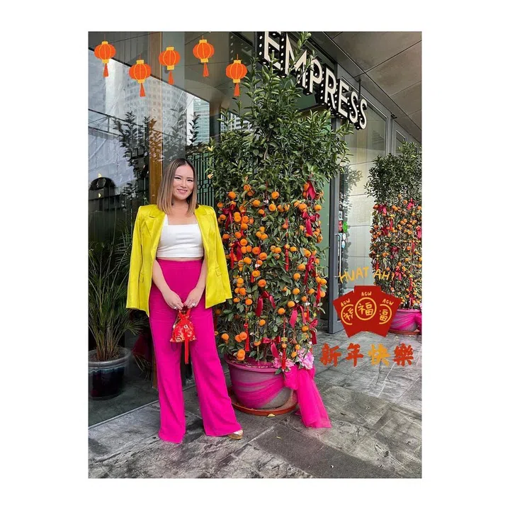 今年无法飞回香港与家人团聚的Sabrina Ho,在新加坡和朋友度过欢乐的新年。今年的新年造型,她选择了明亮抢眼的西装长裤,运用亮黄色与紫红色的巧妙搭配,穿出知性干练的气质。