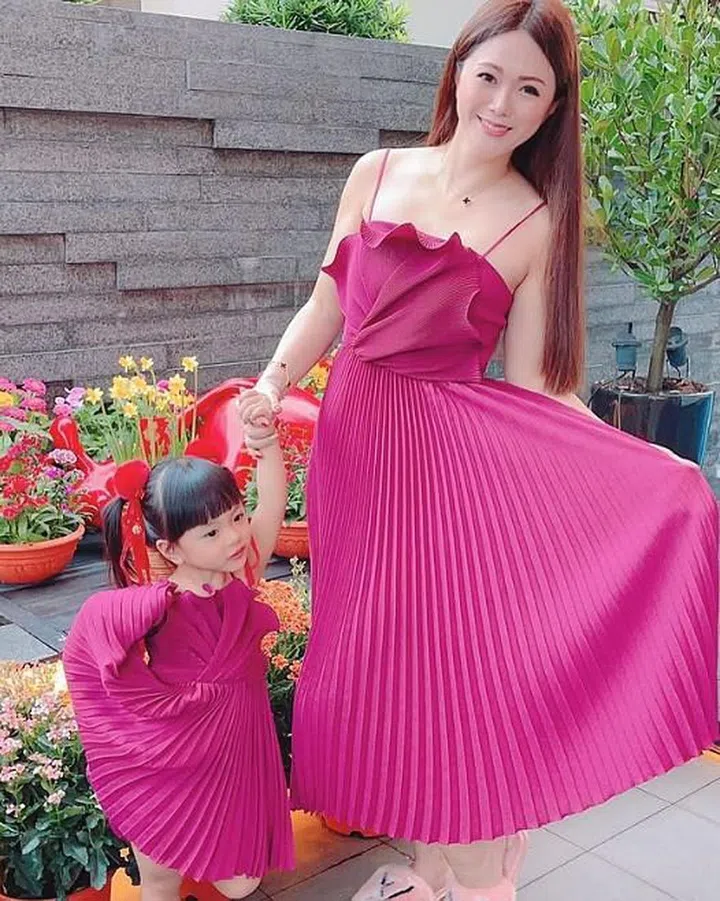 本地名媛 Rachel Wee 和宝贝女儿Ellery穿上同色系的母女装,Rachel的淡紫色连身裙上点缀着甜美的蝴蝶结装饰,为造型增添独特之美。