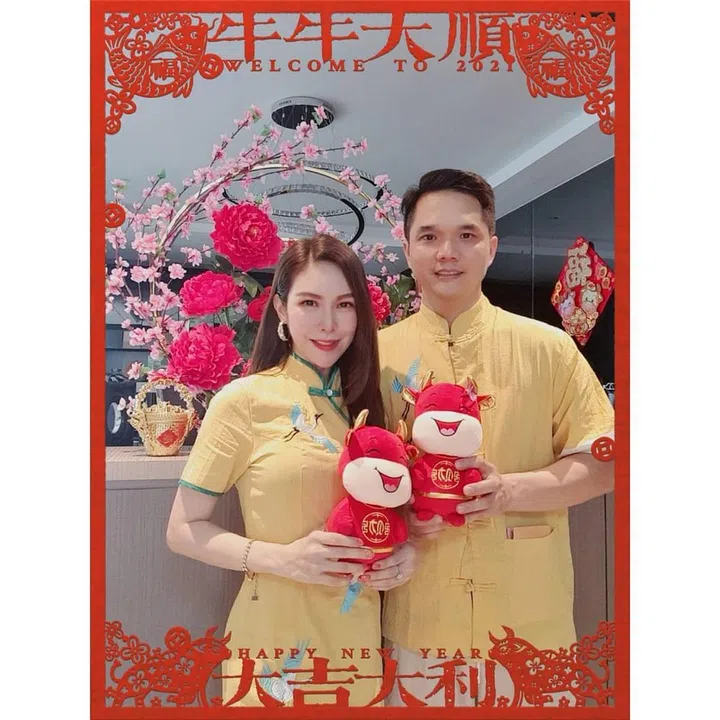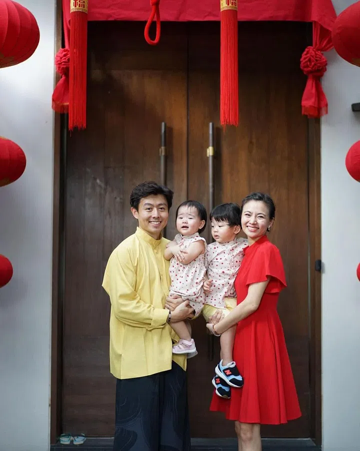 大年初一,Terence Siew和老婆Chermaine Pang身着喜庆的新年衣装,孩子们穿上精致的中式童装,衬托出浓浓的年味,迎接新年的到来。