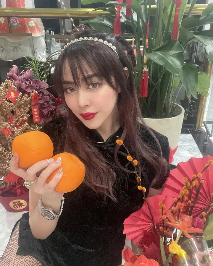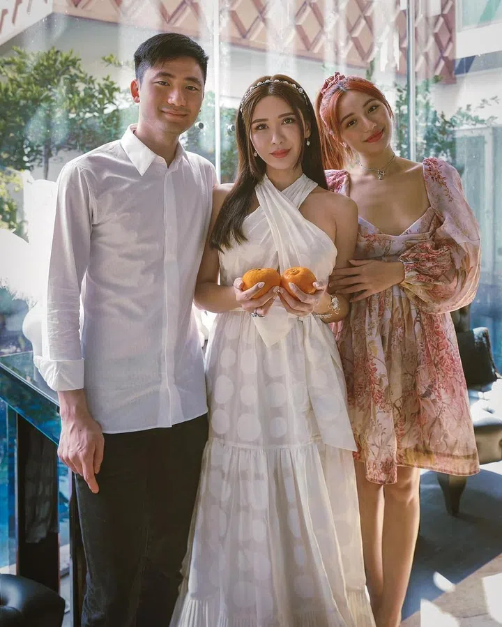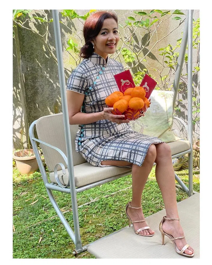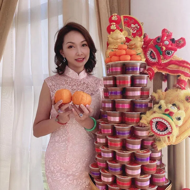 本地珠宝商Belinda Chua和女儿Sabrina Ho皆以喜庆的新年造型迎接农历新年,Belinda身着亮橘色蕾丝中式洋装,Sabrina 则以V字领口泡泡袖连衣裙入镜,漂亮又应景。