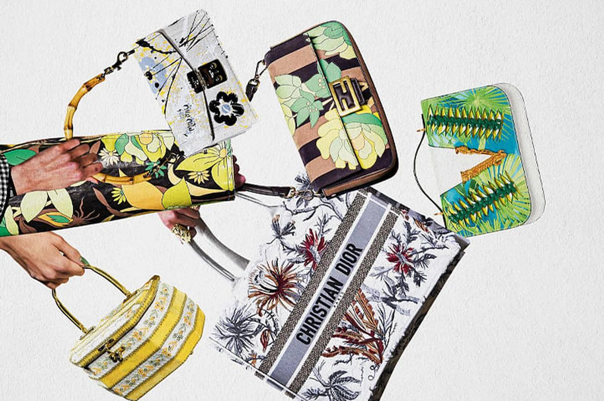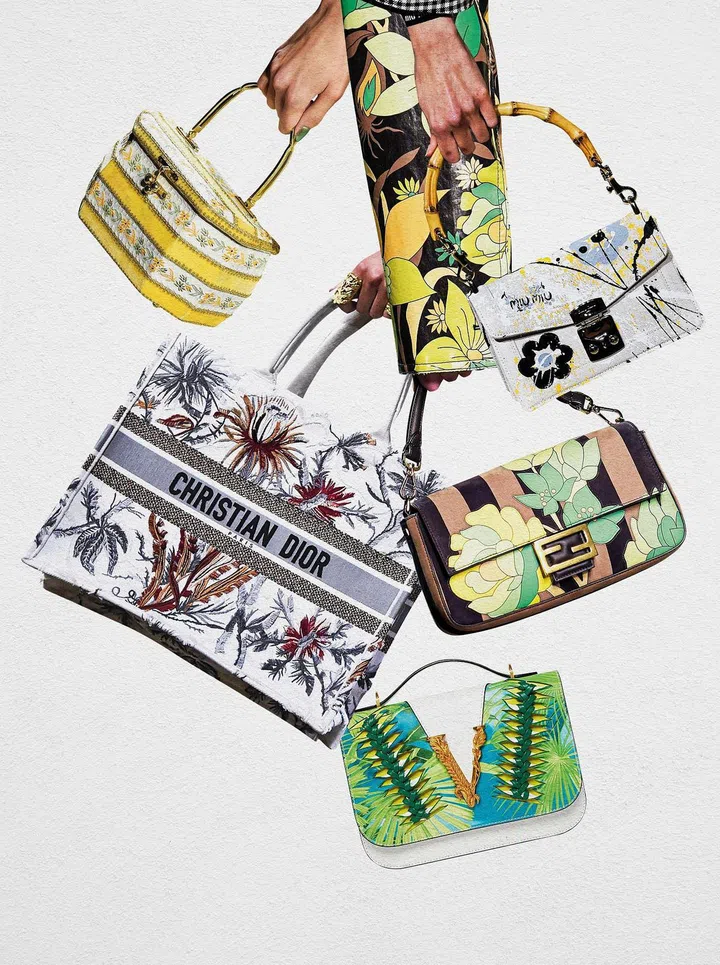 一提到夏天,你会想起什么?是绿油油的草原,还是一望无际的蓝天?这一季,不少时尚设计师不约而同想到了繁花似锦的夏日景象。Fendi 富丽多彩的印花跃上时髦装束与包包,运用色彩之间的碰撞,激发出不一样的风格;Dior新款Book Tote则采用从野性花园汲取灵感的印花;Miu Miu推出的竹节手柄手提包也绣上了娇艳欲滴的花卉,具有自然的美丽;Versace的Jungle丛林印花设计充分体现了品牌本季的特色所在;Michael Kors及Celine的碎花设计,不仅让人想起田园小清新的优雅。