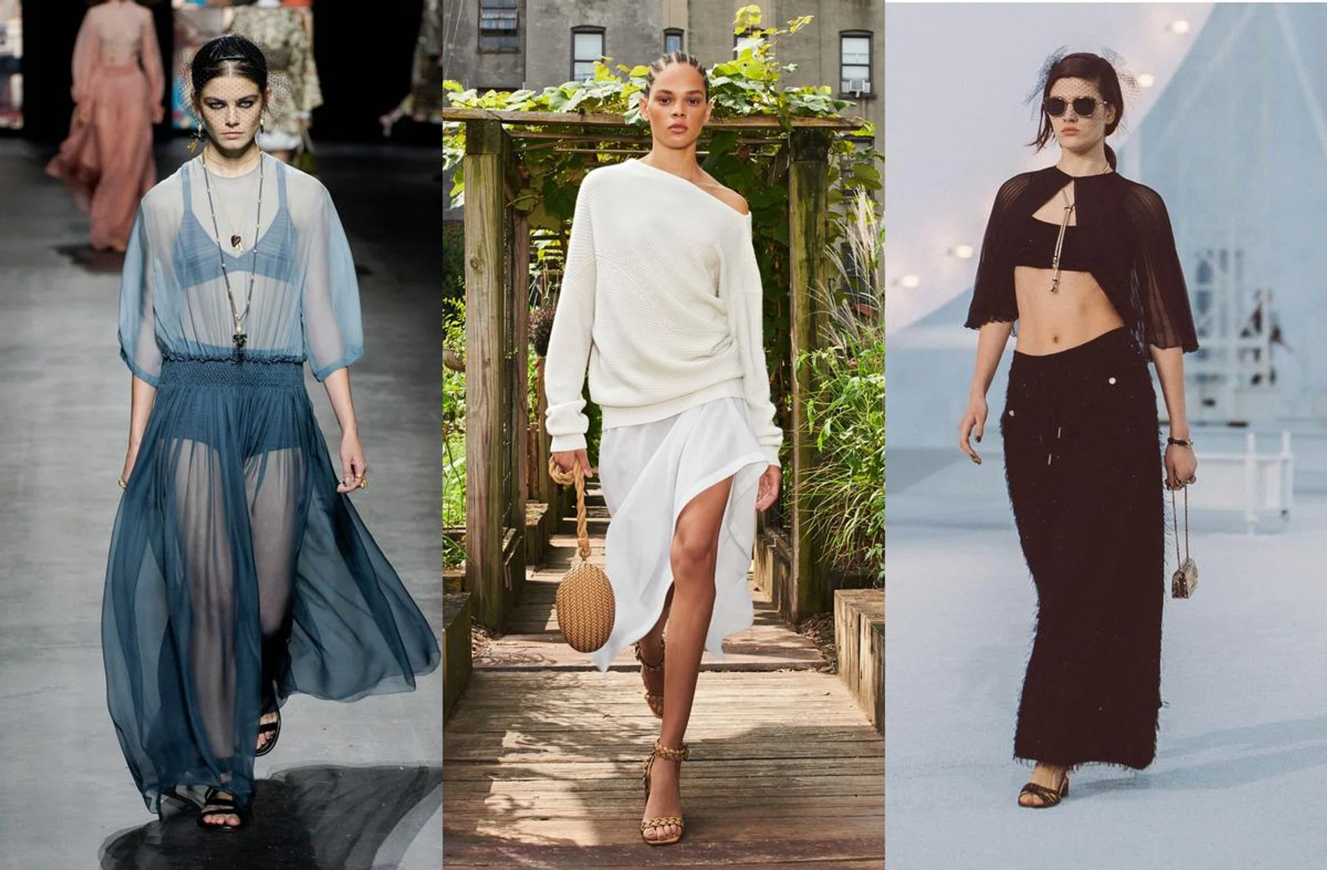 透视感,是近年春夏强调的流行趋向。2021年春夏系列中,透薄材质、可透视面料依然被大量运用。Givenchy新任创意总监Matthew Williams设计的女装造型,以缀满宝石珠饰的薄纱作为半身裙,内衬黑色裤袜,形成鲜明的对比,展现女性的漂亮腿型;Fendi也采用不同色彩的薄纱元素,透过玩转“光影”和“层次”的创作手法打造新风貌;Valentino与Dior也以浪漫的透视裙,为夏日增添一抹清凉与浪漫。