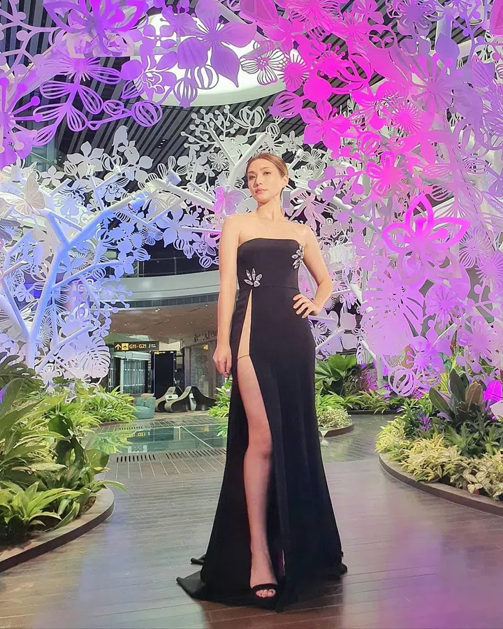 换上第二套Ralph Lauren斜肩礼服的黄暄婷,更显精致女人味,礼服在腰间以镂空设计展现其苗条身材,搭配Cartier珠宝及Christian Louboutin高跟鞋,性感与飒爽兼具。