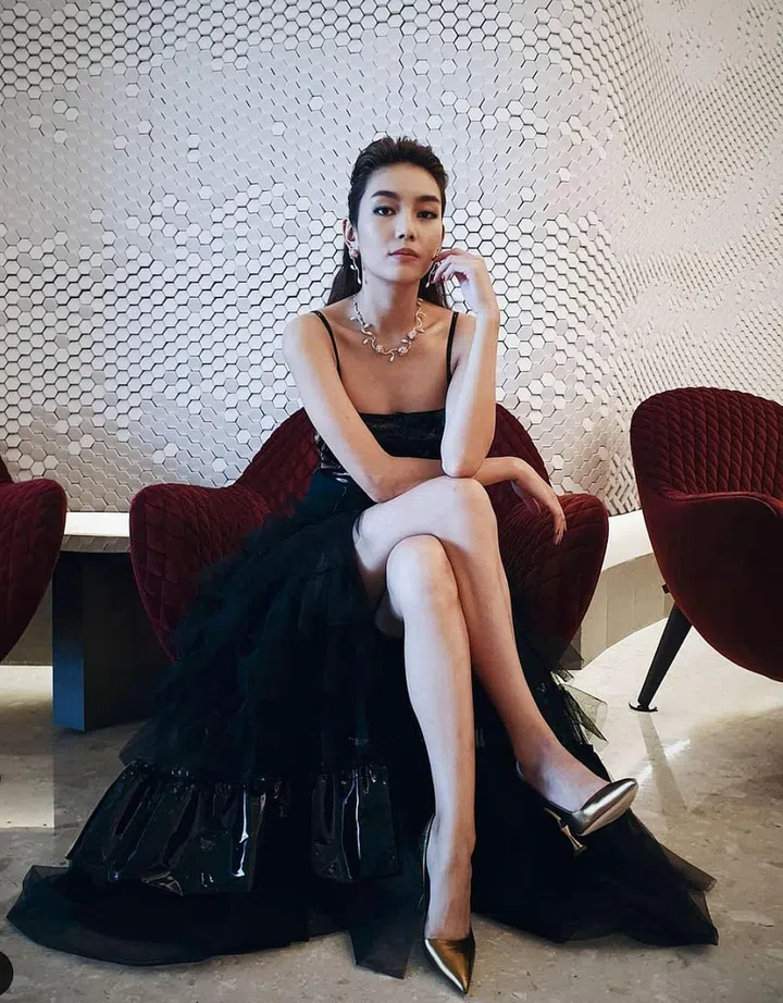 从《才华横溢出新秀 2019》出道的洪丽婷身着Pinko黑色吊带连身裙,搭配Manolo Blahnik高跟鞋及Yuli Jewellery珠宝,若隐若现的薄纱裙摆,展现性感率性的穿搭风格。