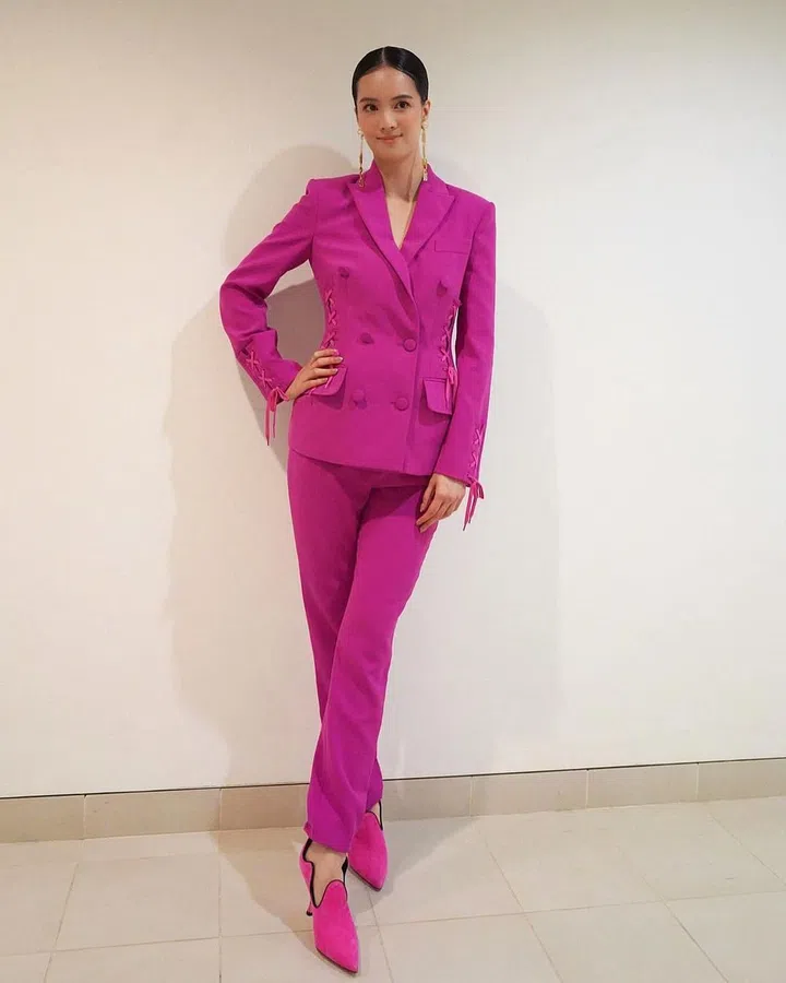 红毯上不再只是常礼服的天地,郑颖身穿Moschino的桃粉色西装造型,外套的腰间及袖口饰有绑带设计,搭配同色系的Manolo Blahnik高跟鞋,梳起干净利落马尾发型,宛如干练的粉色芭比。