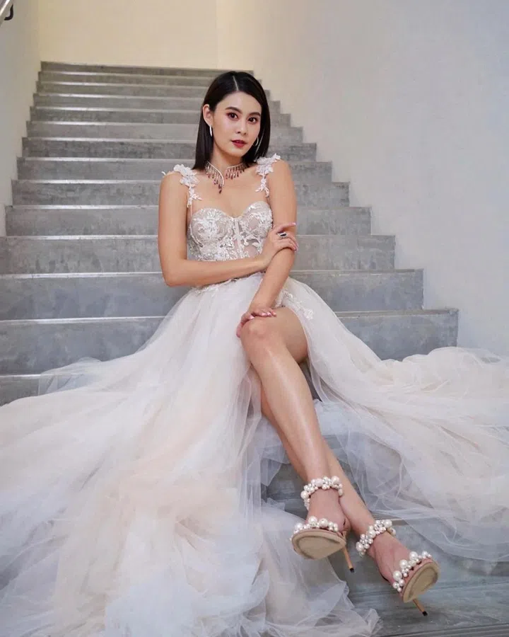 陈楚寰身穿Berta白色礼服华丽亮相,搭配Jimmy Choo系带高跟鞋,吊带式刺绣薄纱上身设计若隐若现,搭配飘逸的白色开叉裙摆,行走间隐约露出腿部曲线,十分吸睛。
