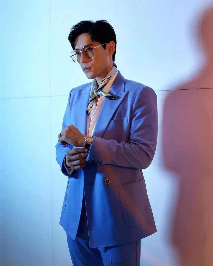 今年1月刚完婚的谢俊峰,今晚身穿Dolce & Gabbana的亮蓝色西服,还特别加上一条丝巾做点缀,既帅气又大方,充满复古风韵。