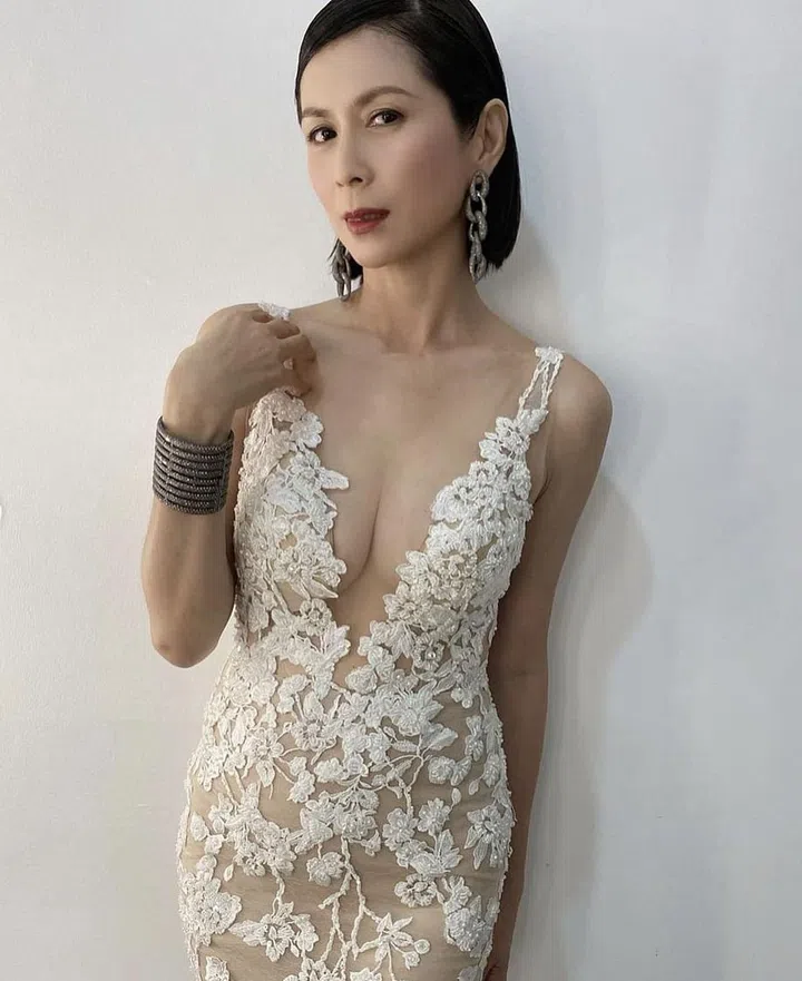 今年52岁的潘玲玲,依然维持苗条身材。今晚,她选择了Berta的白色深V低胸礼服,将其火辣身材完美展露,不仅勾勒出女性的曲线美,且优雅迷人。