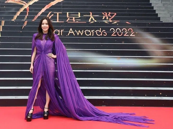 凭《过江新娘》钟佩佩一角入围女配角奖的许美珍,身穿亮丽Moschino的连衣裙,色彩斑斓的波点图案,极具设计感,散发独具一格的气场。