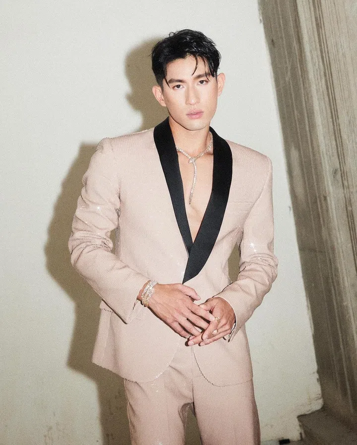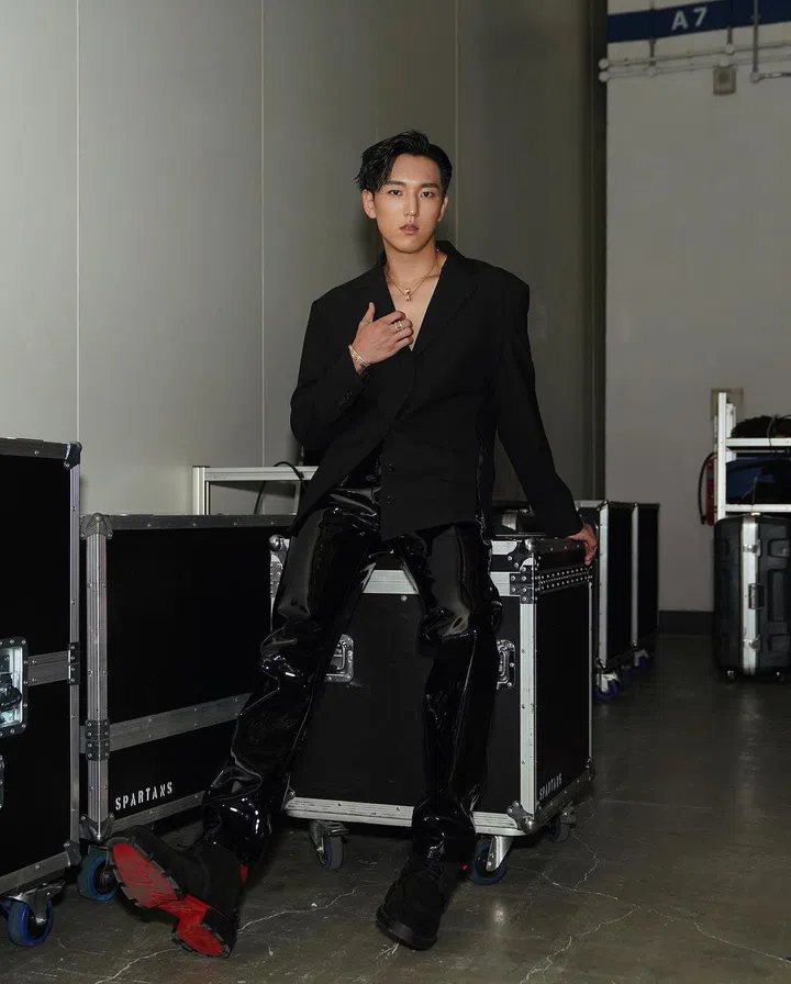 翟思铭以一身略微宽松的西装外套,搭配亮面漆皮材质的长裤,在材质上形成强烈反差,充满个人风格特色,配上Christian Louboutin鞋履,时髦前卫。