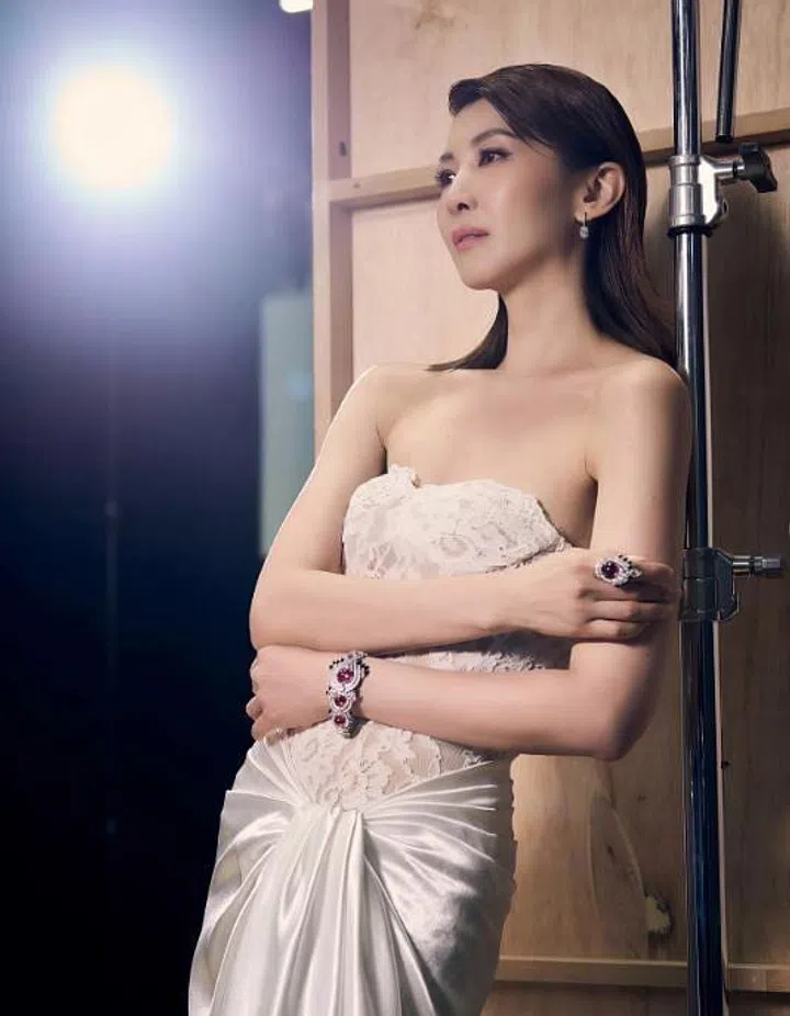 雅慧身穿Maria Lucia Hohan金色束腰(corset)式晚礼服,其设计巧妙地突出了她的身形曲线,彰显女性之美。