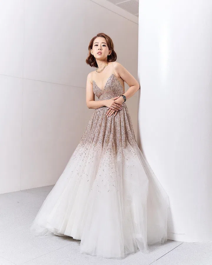 胡煜诗身穿Nicole + Felicia渐变色亮片晚礼服,吊带低胸设计,散发璀璨光彩。