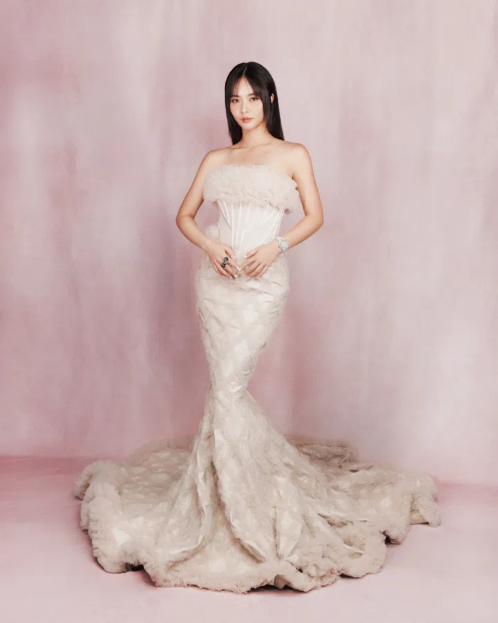 黄暄婷身着中国设计师品牌White Abyss米白色套装。立体花卉般薄纱抹胸设计,搭配膝部极致鱼尾廓形,凸显曼妙腰线。裙尾如海浪般四周舒展,尽显优美韵律美。