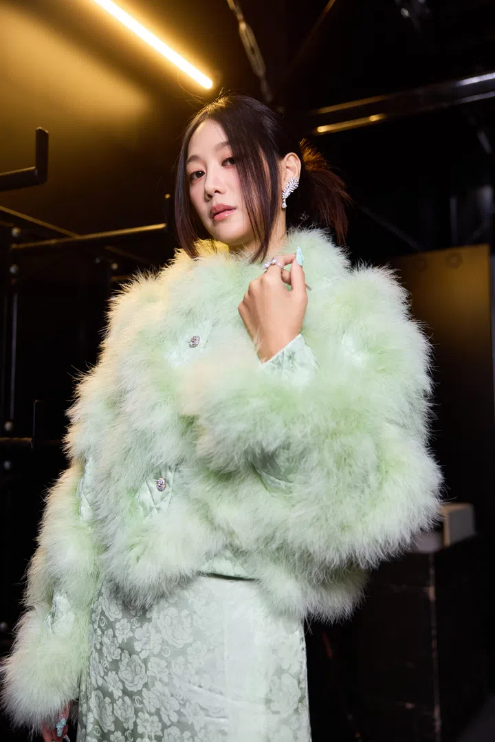 刘怡伶身穿Chanel 2024/25高级手工坊系列(Métiers D’art)Look 60套装。浅色真丝菱格纹外套饰以柔软羽毛,随风飘动,搭配同色系山茶花刺绣真丝裙,仙气满满。