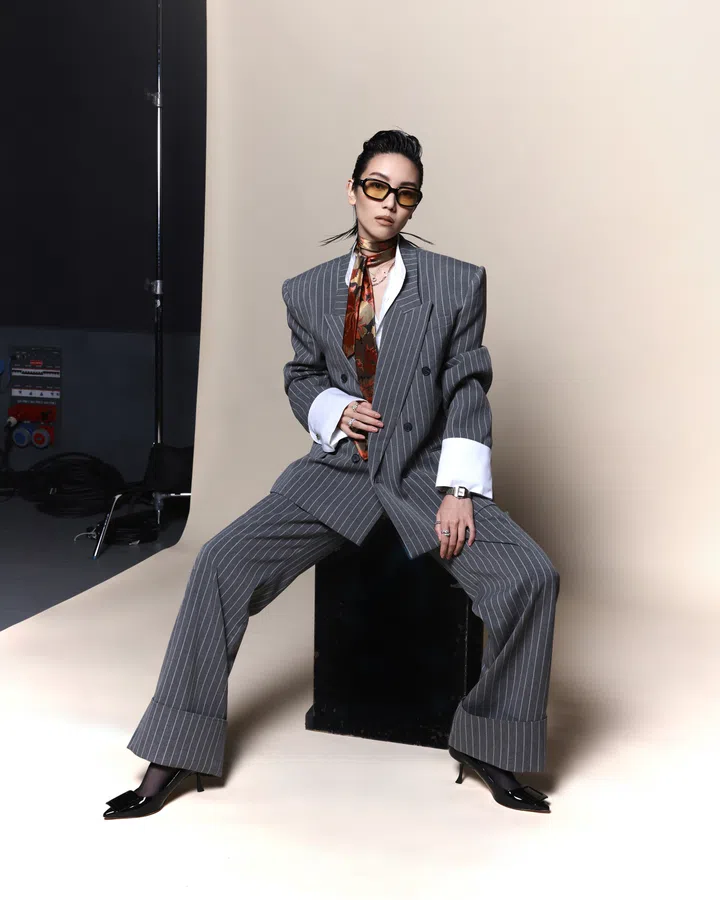 黄俊雄身穿Maison Sans Titre 2025 春夏系列灰色套装。深V领若隐若现尽显美感,搭配垂感十足的阔腿西裤,慵懒随性之余完美诠释绅士高级感。