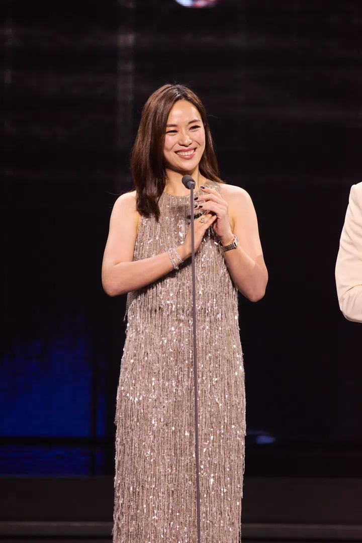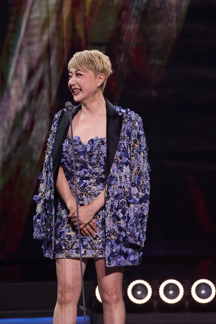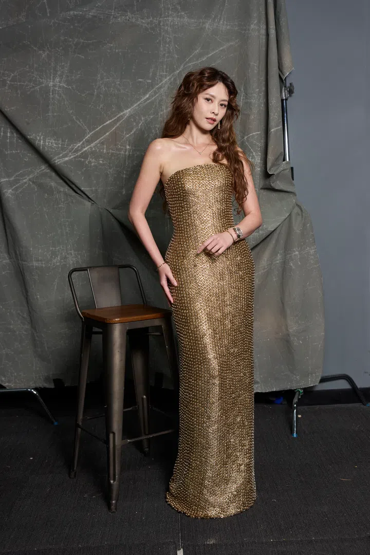 何盈莹身穿Adeline Ester特别定制礼服。裙身镶嵌万千鎏金亮片与立体水晶,宛如神话中的黄金女神,奢华且极具质感。