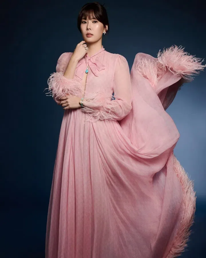 黄思恬一袭粉色薄纱长袖礼服惊艳亮相星光大道。作为Gucci “La Famiglia”2026春夏系列第31套造型,这条名为“La Principessa”的裙子极具浪漫宫廷氛围。领口以粉色蝴蝶结作装饰,胸口镂空设计则增添一分性感魅力。袖口与裙摆的羽毛镶边随风飘动,温柔贵气中流露几分少女的灵动。