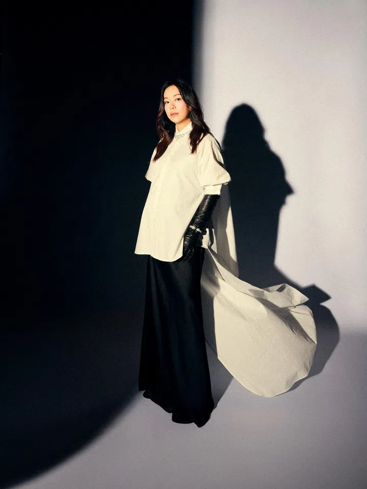 林慧玲身穿Balenciaga 2026春夏系列第8套造型,以舒适极简风格亮相红毯。宽松白色衬衫正面平平无奇,背后却暗藏玄机,超长拖尾设计格外新颖独特。黑色缎面长裙搭配同色亮面手套则为整体造型增添几分沉稳气场,凸显林慧玲优雅知性的气质。