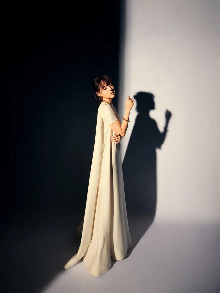 沈家玉身着Celine米白色斗篷式直筒真丝长裙,极简廓形搭配利落立体短袖设计,背后垂坠的披风随步履流动,将高级剪裁与松弛气场完美融合,简约中尽显高级格调。