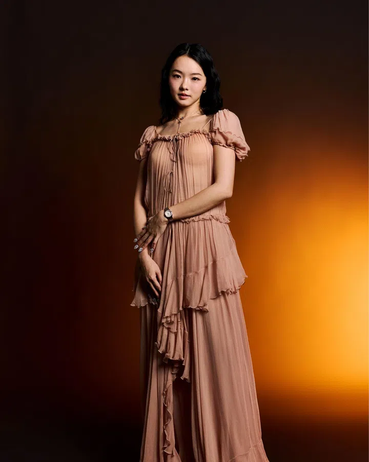 林詠谊身着Chloé 2026春夏系列的裸粉色泡泡袖荷叶边连衣裙。这款出自品牌创意总监Chemena Kamali的设计以轻盈通透的面料充分刻画了独属女性的柔婉气质。荷叶边裙摆随步履轻曳,自带优雅朦胧美感,使得林詠谊宛如欧式油画中的柔美少女。