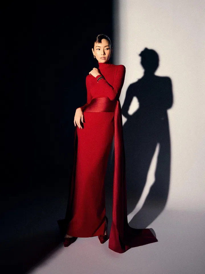 一改去年干练中性风,洪丽婷化身“气场女王”,选择Solace London拖尾修身红裙作为今年“战袍”。高领长袖设计凸显她纤细紧致的身材曲线,修身剪裁完美贴合身形。腰部缎面材质的腰封在光影下变幻,摆脱纯色的单调感。
