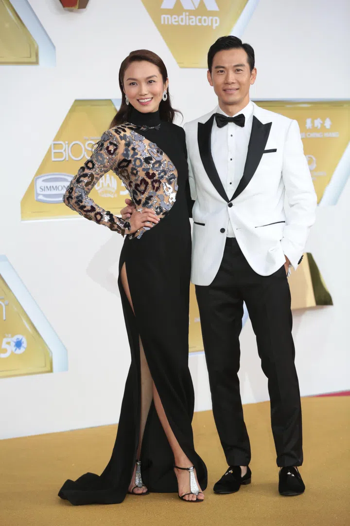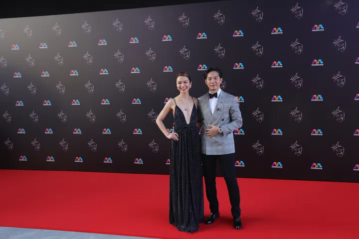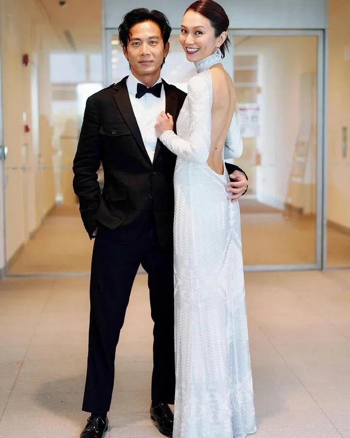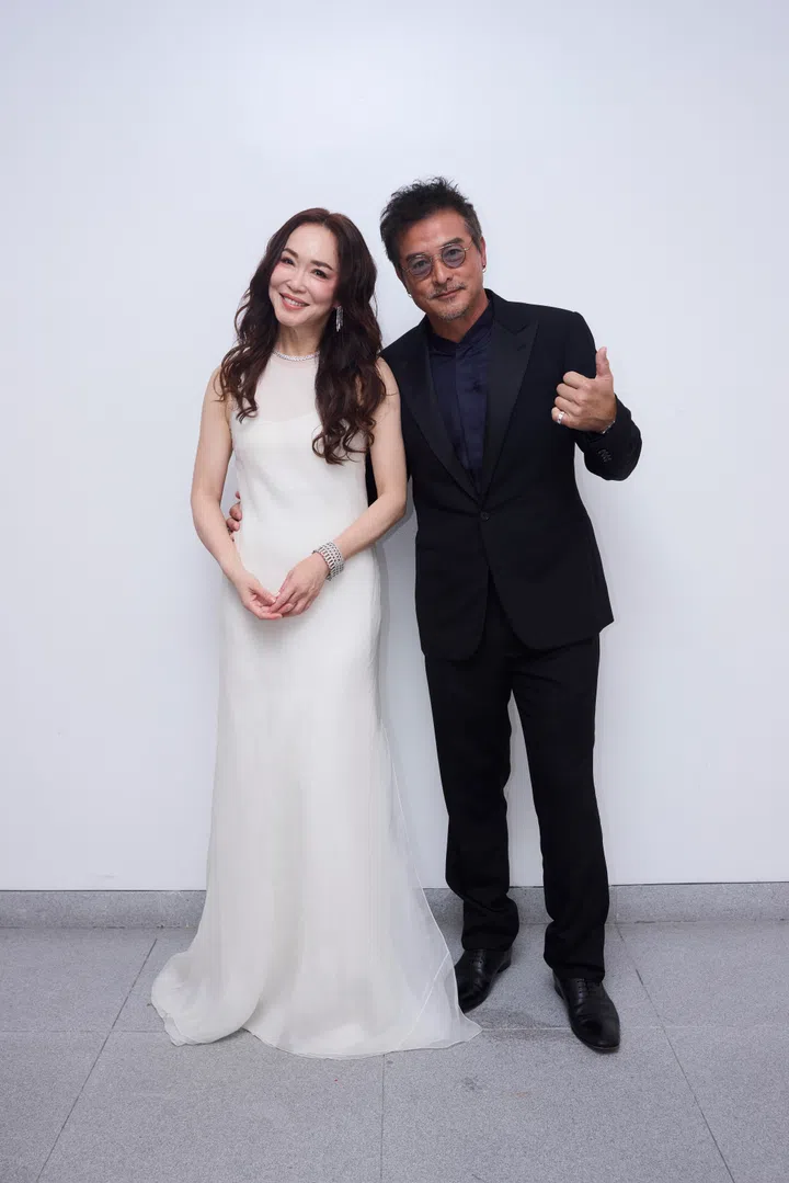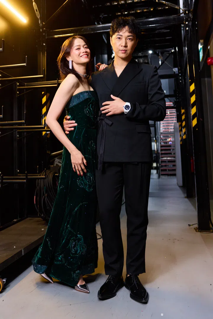 陈凤玲以一袭Giorgio Armani深绿色天鹅绒礼服亮相,礼服饰以立体绣花与珠饰点缀,在灯光下闪耀出低调华丽的光泽。徐鸣杰则选择Dolce & Gabbana黑色斜襟西装,腰间绑带设计别出心裁,为简约剪裁增添亮点。两人造型相互映衬,默契十足,展现出红毯情侣的独特风采。