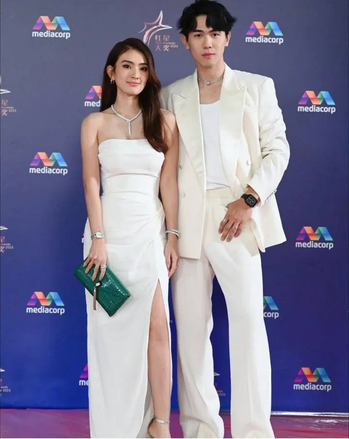 一黑一白的情侣档穿搭,不用多说也能感受到甜蜜。田铭耀身穿一袭Dolce & Gabbana白色西装;刘子绚则以一袭Nicole+Felicia 2024秋冬系列黑色露肩修身晚礼服,配上立体花朵点缀披肩,脚踩Christian Louboutin高跟鞋,女神魅力不可挡!