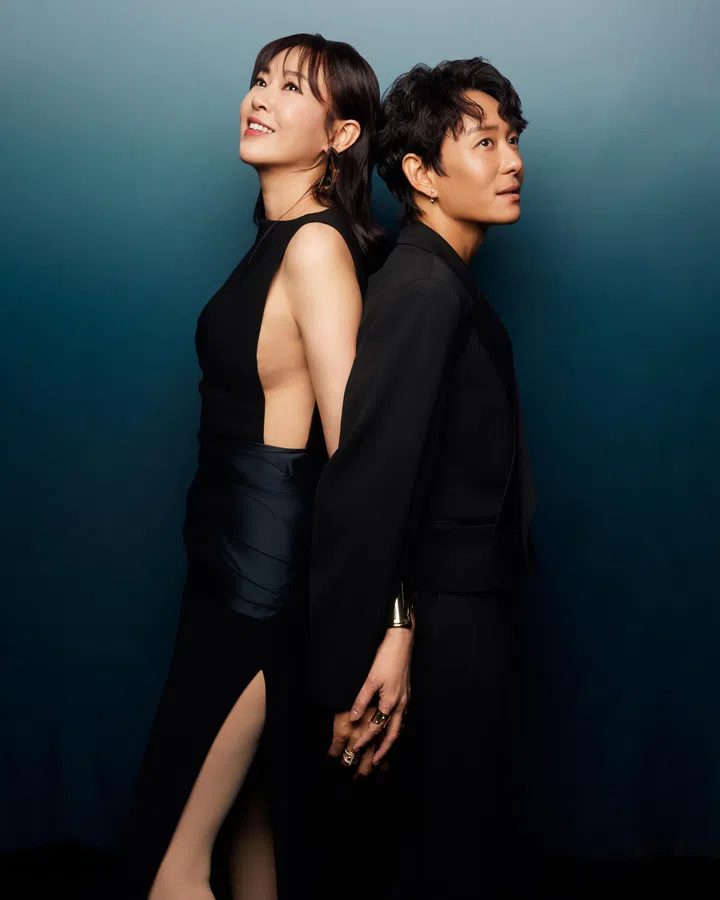 洪凌与张奕恺皆以西装造型亮相红星大奖,女方身穿帅气的三件式西装套装,搭配白衬衫、黑领结及醒目的垂坠耳环,在中性风格中展现妩媚气质。张奕恺则选择缎面提花西装外套,低调中流露精致质感,与女方造型相映成趣。