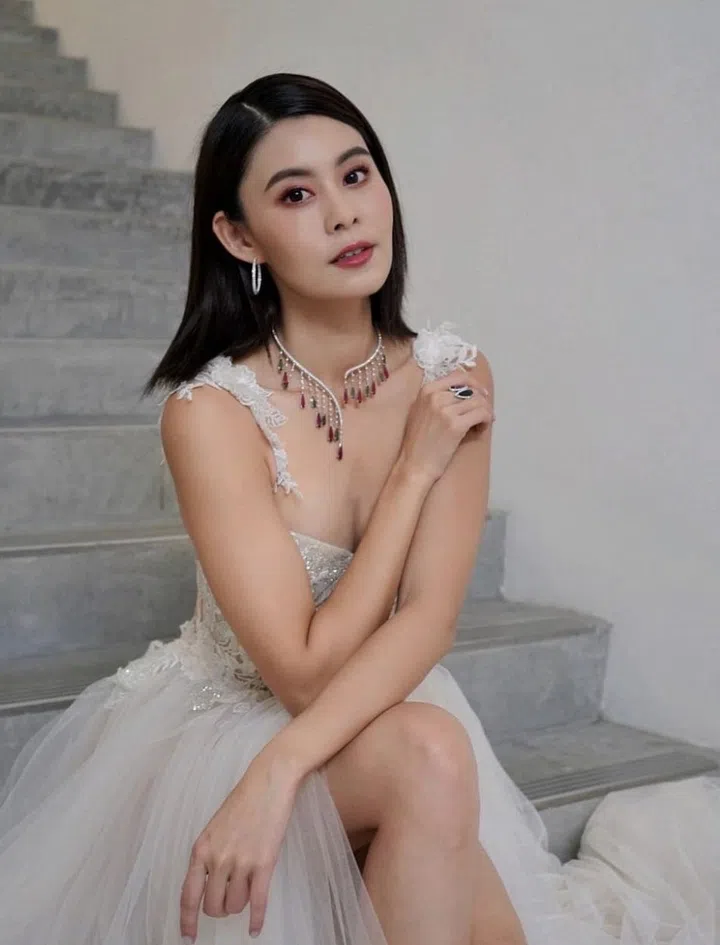 陈楚寰身穿Berta白色礼服华丽亮相,搭配Jimmy Choo系带高跟鞋,吊带式刺绣薄纱上身设计若隐若现,搭配飘逸的白色开叉裙摆,行走间隐约露出腿部曲线,十分吸睛。