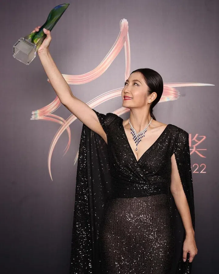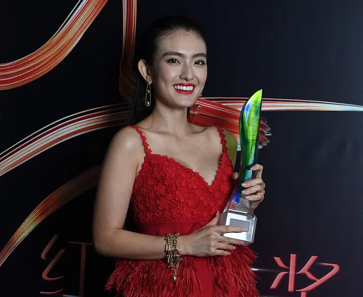 获得本届视后的黄碧仁,身穿一袭披风效果黑色晚装,裙身覆盖着闪耀夺目的亮片缀饰,衬托出典雅高贵气质。