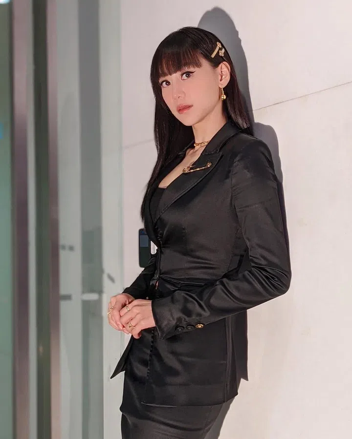 西装外套未必只能搭配长裤,刘怡伶的Versace造型以修身的黑色西装外套,搭配开叉半身裙,服装上的金属别针细节,也为整体增添时尚亮点。