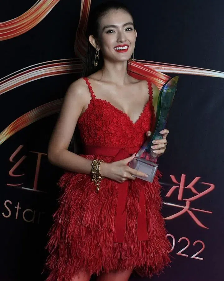2022年第二次获得“十大最受欢女艺人”的洪凌,从红毯上的黑色蕾丝裙亮换上红色吊带短礼服,低胸设计秀出好身材,搭配红唇妆容,十分吸睛。