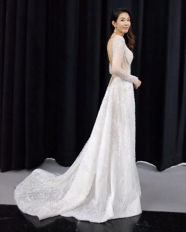 黄思恬以奢华绚丽的Nicole + Felicia低胸晚装登场,裙子上的亮片细节再灯光下闪亮迷人,彰显华丽大气之美。