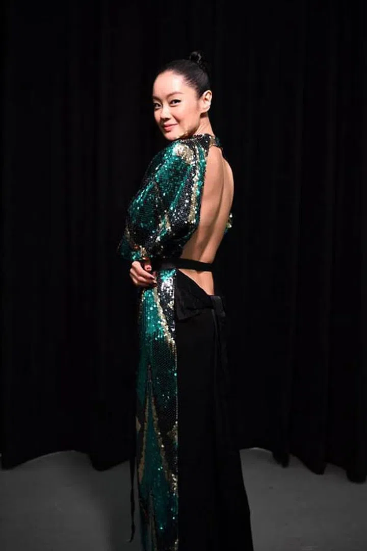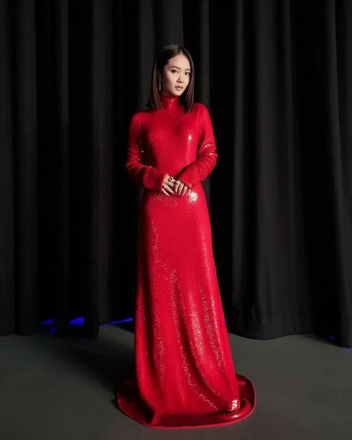 在《过江新娘》中饰演“芳草”的黄暄婷,以实力派演技征服观众。2022年首次入围最佳女主角的她,以一袭Bottega Veneta的红色亮片修身晚礼服华丽现身,高领长袖与背面的夸张露背形成鲜明对比,举手投足间流露出精致女人味。