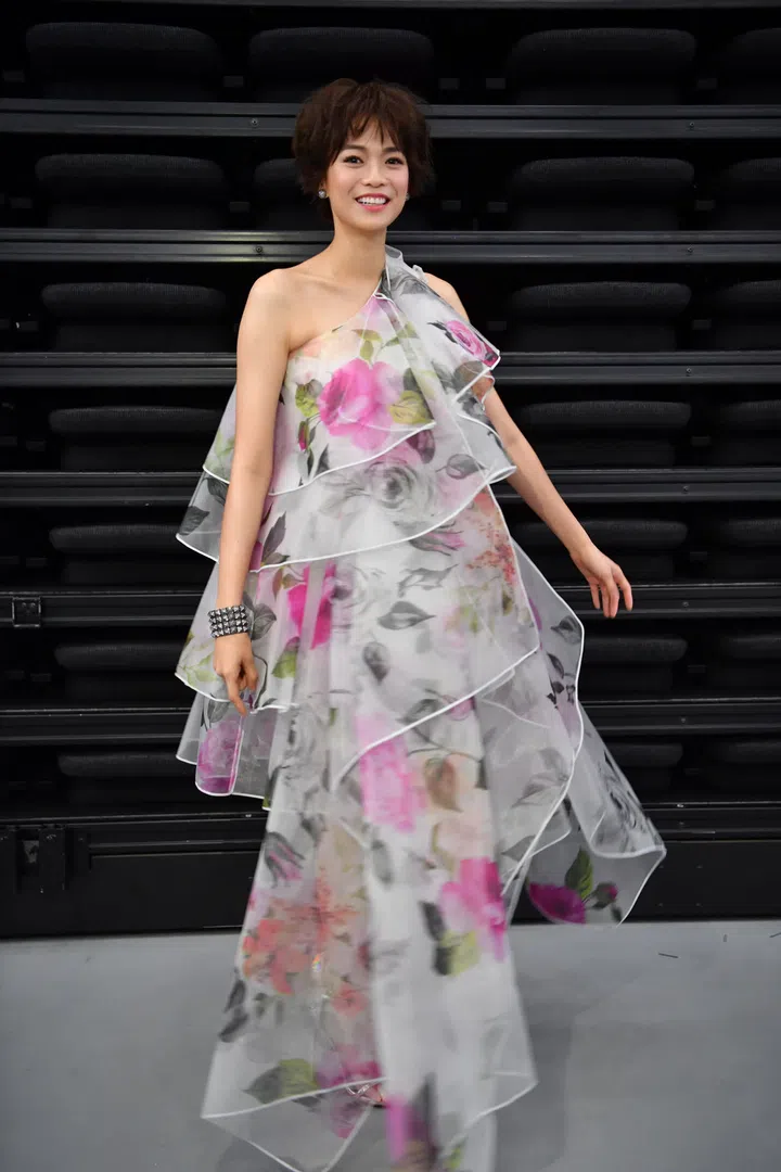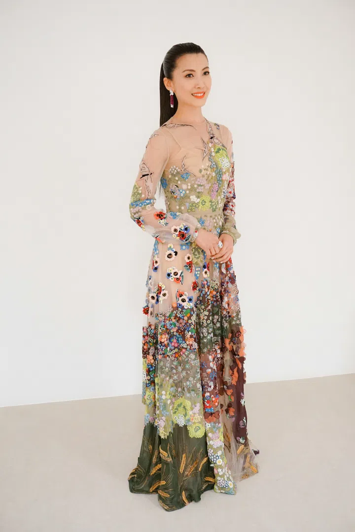 阿姐郑惠玉身穿Oscar de le Renta的层接式花卉贴花礼服,设计别具匠心,贴花的工艺让花朵与礼服融为一体,营造出浪漫的视觉效果,完美展现女王气势