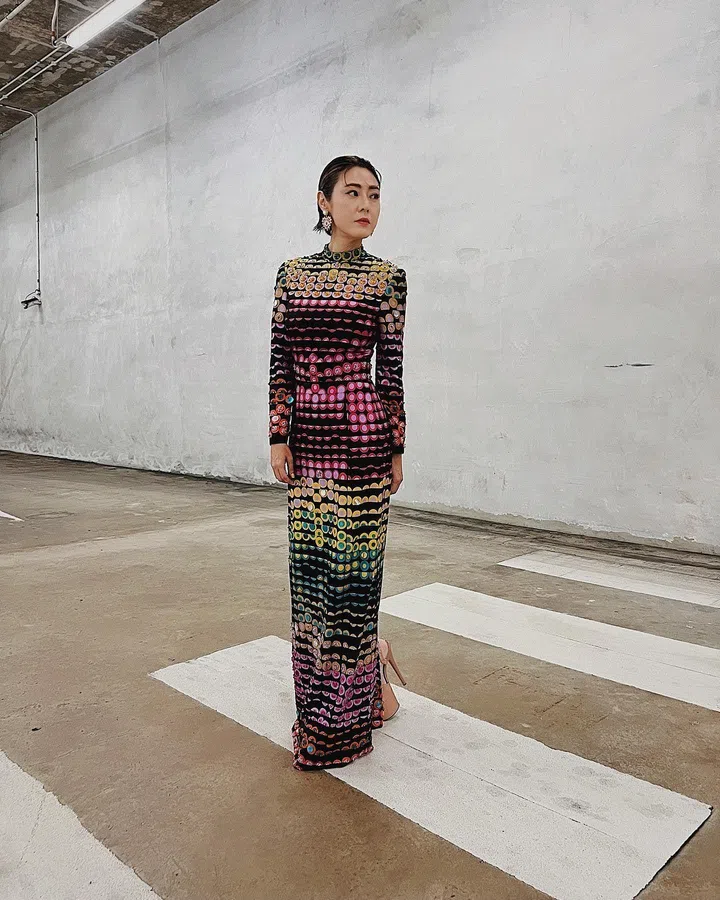 凭《过江新娘》钟佩佩一角入围2022年最佳女配角奖的许美珍,身穿亮丽Moschino的连衣裙,色彩斑斓的波点图案,极具设计感,散发独具一格的气场。