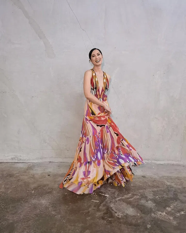 蔡琦慧身穿Etro真丝印花挂脖式晚礼服步上红毯,深V剪裁性感不低俗,一举一动飘逸着美感。