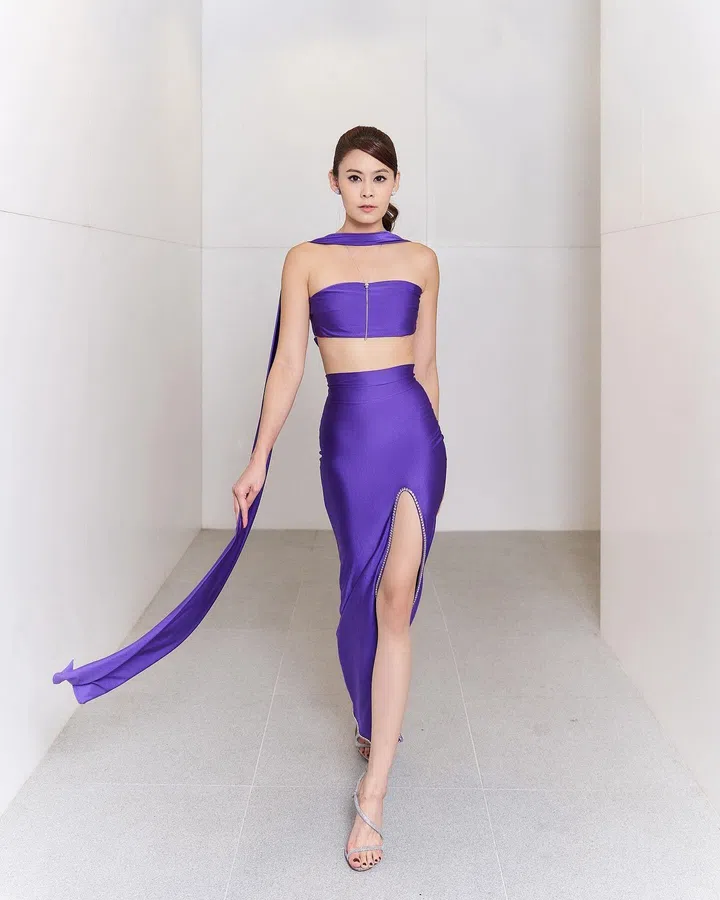 陈楚寰身穿来自Khanum’s的紫色两件式晚礼服,这款晚礼服采用短款剪裁与高开叉设计,极具性感魅力。