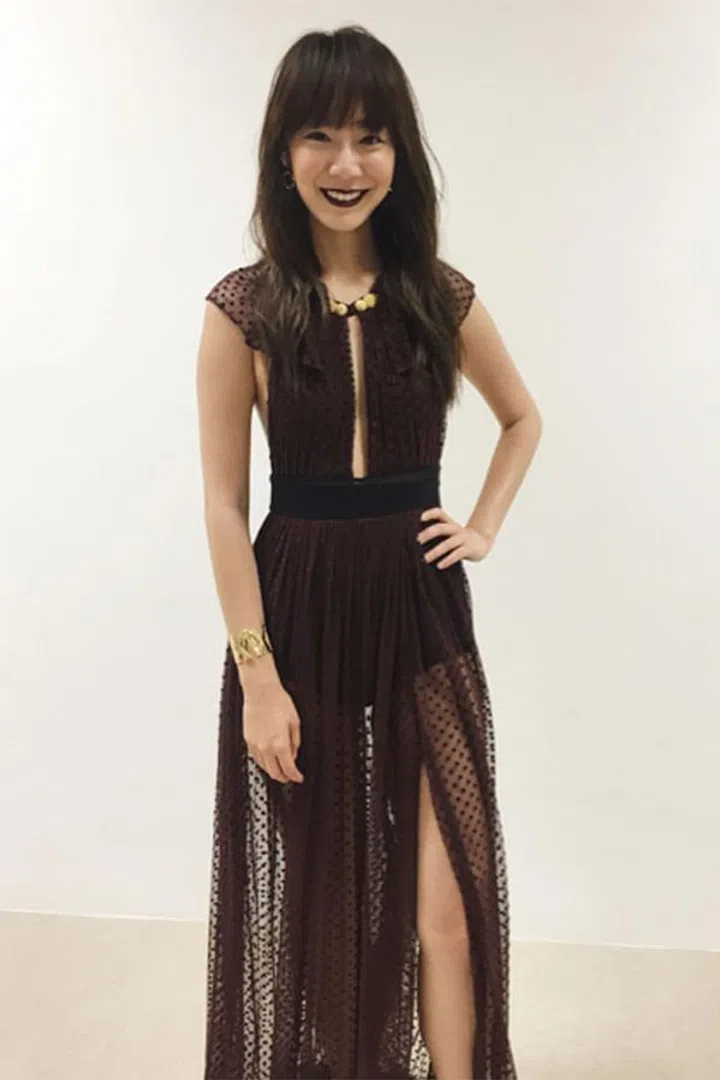 陈欣淇身上的Burberry礼服与黄思恬的有异曲同工之妙,虽同样开到肚脐及隐约秀出双腿,但圆点的薄纱让性感的造型增添一丝俏皮感。