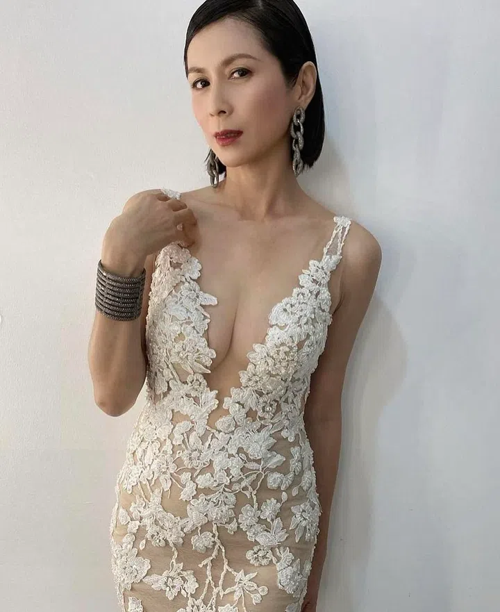 52岁的潘玲玲,依然维持苗条身材。今晚,她选择了Berta的白色深V低胸礼服,将其火辣身材完美展露,不仅勾勒出女性的曲线美,且优雅迷人。